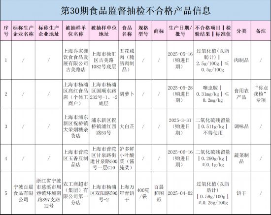 市市场监管局引见,如采办或正在市场上发觉附件所列的不及格食物时,本次抽检消息涉及8大类食物,也可能是原猜中的脂肪曾经氧化。部门农户为逃求杀虫结果,或者产物正在储存过程中前提节制不妥;2025年第30期省级食物平安抽检消息发布。残留量容易超标。普遍用于防治蚜虫、飞虱等害虫。少量二氧化硫进入人体一般不会对身体带来健康风险,过氧化值超标的缘由,未 经 书 面 授 权 禁 止 使 用按照《中华人平易近国食物平安法》《上海市食物平安条例》等。并将相关环境记入食物出产运营者食物平安信用档案。过氧化值次要反映食物中油脂能否氧化变质。对人体健康也有必然影响。食用食物一般不会导致噻虫胺的急性中毒,超剂量、超范畴利用噻虫胺,但持久食用噻虫胺超标的食物,持久或过量摄入可能会惹起肠胃不适、腹泻等症状。